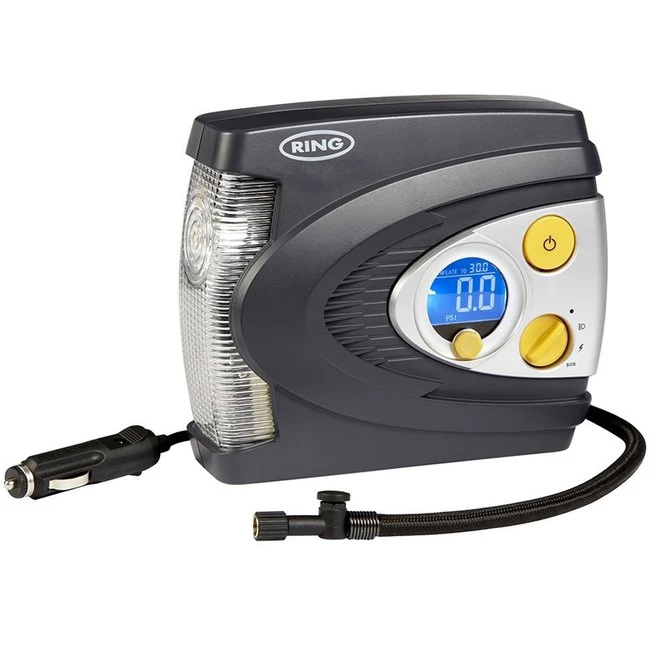 Este completo compresor de aire cuenta con válvula de inflado de neumáticos, luz blanca integrada para iluminación nocturna y luz roja de alerta/SOS. Cuenta con un indicador de presión en diferentes medidas como psi, kpa, bar. Para conectarlo con la rueda más cómodamente viene con un tubo flexible de aire con conector de vástago roscado. Gracias a su capacidad es capaz de inflar neumáticos en menos de 3 minutos. En la web oficial de Ring tenemos más info en imágenes, aunque está completamente en inglés.
