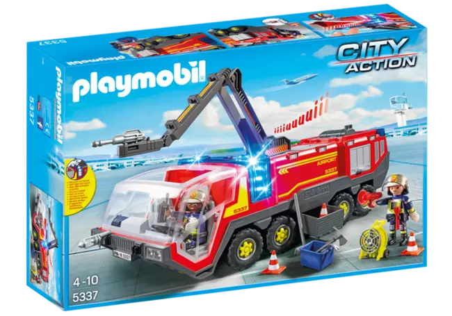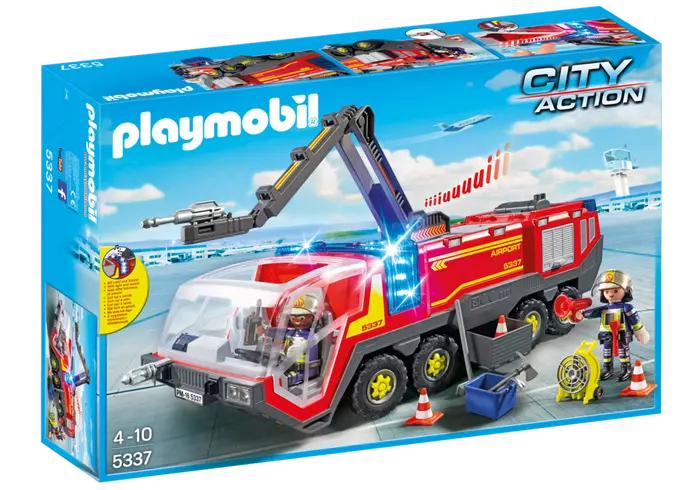 El camión de bomberos del aeropuerto de Playmobil es uno de los últimos lanzamientos de la serie city action, compuesta por un gran número de vehículos de emergencia y ayuda ciudadana. Este camión de bomberos está adaptados para el rescate y la extinción de incendios en aviones. Cuenta con luz y sonido para darle a la sirena toda la atención que necesita.