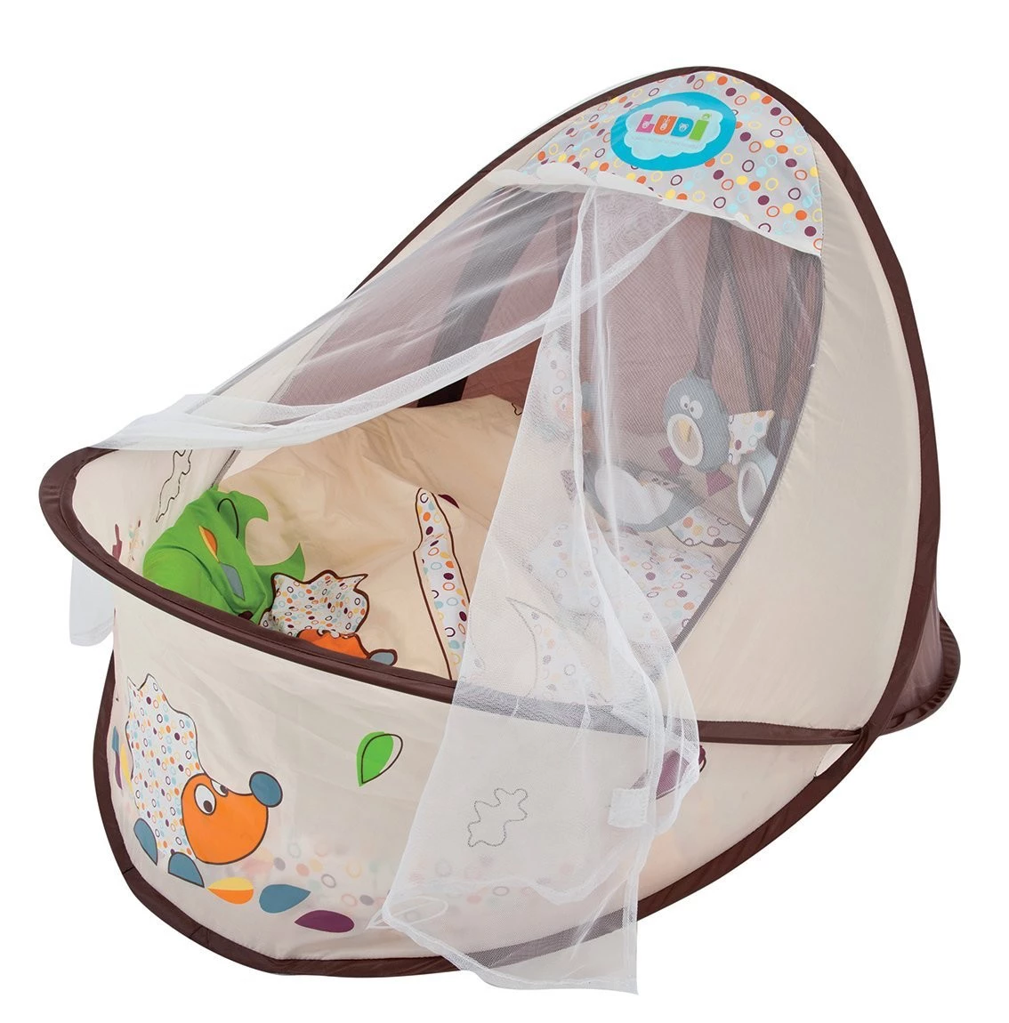 Esta cuna portátil es realmente ligera (Pesa alrededor de 1100 gramos) y es ideal para viajar con el bebé especialmente a lugares donde no podamos disponer de cunas alternativas, como por ejemplo un camping. Es fácil de abrir y se hace en segundos, mientras que el plegado, sin ser difícil, requiere un poco más de práctica sobre todo al principio. Viene con un colchón extraíble para la mayor comodidad del bebé. Una vez abierta la cuna tiene unas dimensiones de 85x60x90cm. Para transportarla viene en una cómoda bolsa como la imagen: