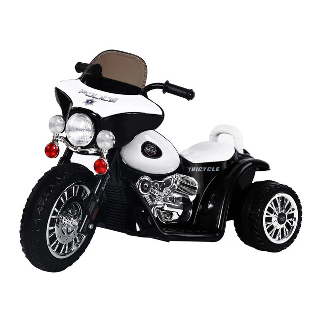 Una moto tipo triciclo, con un diseño policial en dos colores (negro y blanco). Con una batería de 6 voltios, se recarga en unas 8-12 horas y cuenta con varios certificados de seguridad como el CE.