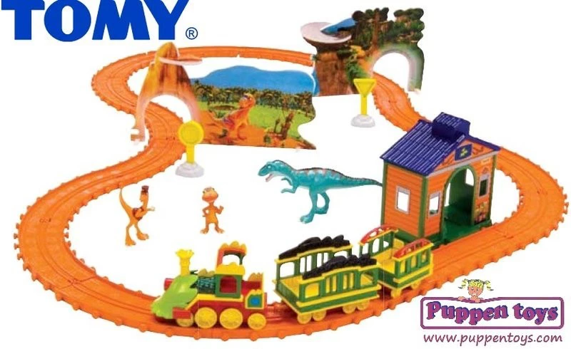 Se trata de un juguete para niños a partir de 3 años que consiste en un circuito de aventuras motorizado con dinosaurios y una locomotora que se van moviendo por la pista. La pista de tren es de aproximadamente dos metros y vienen con un montón de accesorios para hacer un circuito más bonito y divertido.