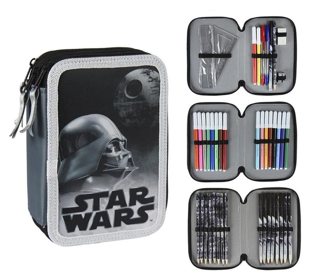 Como se puede observar en la imagen superior estamos ante un estuche plumier con diseño star Wars en el que Darth Vader y su estrella de la muerte son protagonistas. El plumier cuenta con tres secciones: una para las reglas, bolis y lapiceros; otra sección para rotuladores y una tercera con lapices de madera para pintar. En total, como ya hemos señalado, son 42 accesorios.