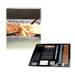 Como podemos ver en la imagen superior este kit se compone de un estuche portable de aluminio con 25 piezas entre las que se incluyen 4 lápices de colores pastel, 4 lápices de grafito, 4 grafito bosquejo palos, palos de 3 tabletas de carbón, 2 lápices de colores pastel y lápiz de grafito. El set también viene con palillos, cepillo y lápices de abrasión.