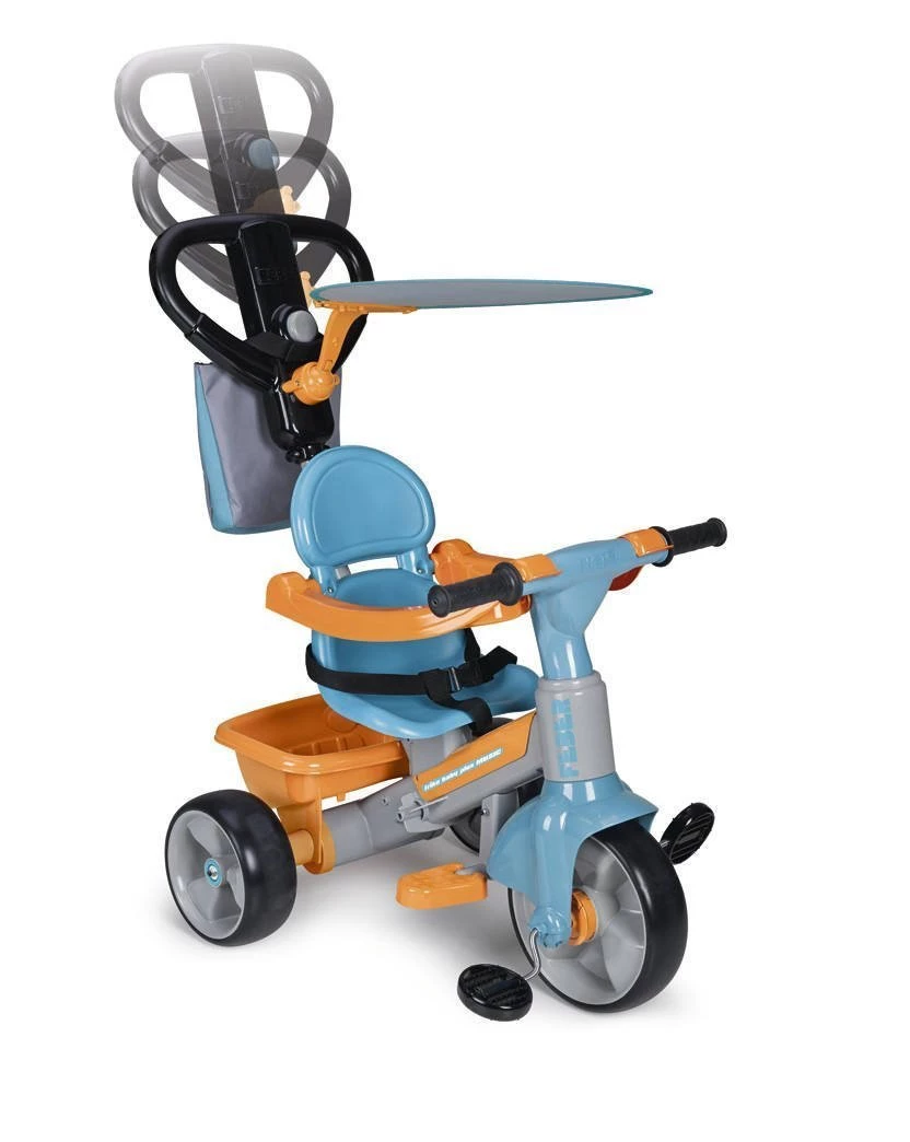 Este triciclo de Feber es evolutivo permitiendo su uso a niños de entre uno a cuatro añas adaptándolo a las necesidades de cada momento. al principio funciona como carrito de paseo con reposapiés plegable para después pasar a triciclo con pedales. El asa de empuje se puede regular en tres posiciones de altura adaptandose a la altura del adulto que empuja y ocultándose cuando no es necesaria. Cuenta también con ruedas de goma silenciosas. El asiento también es regulable en dos posiciones e incluye cinturón de seguridad. Uno de sus principales atractivos es que posee un pack de luces y sonidos para un paseo entretenido. Como se ve en la siguiente imagen también incluye un portabotellas: