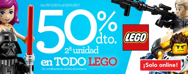 - 50% de descuento en la segunda unidad: Una magnífica promoción en la que al añadir al carrito 2 artículos identificados con la etiqueta "2ª unidad al 50% en todo LEGO" automáticamente se aplicará un descuento de 50% a la unidad de menor valor. Casi todos los artículos Lego entran dentro de esta promo.