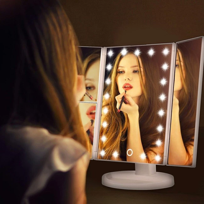 Este espejo con 3 paneles y diferentes aumentos permite maquillarte con toda precisión, gracias a sus luces LED con intensidad regulable por un botón táctil. El resultado es la recreación de luz natural perfecta para un maquillaje profesional.