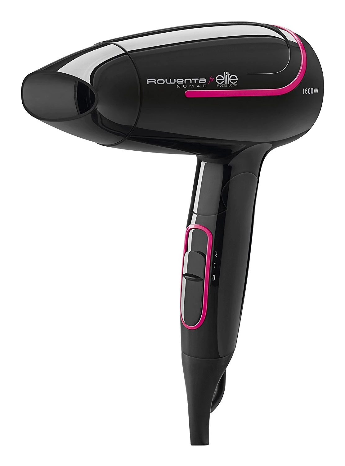 Se trata de un secador de viaje de color negro y con una linea en color rosa, que trae un asa para poder transportarlo facilmente. Tiene una potencia de 1600W, con doble voltaje de 110-127 V y 220-240 V, 2 posiciones diferentes de velocidad y que trae una boquilla de aire concentrado.