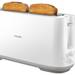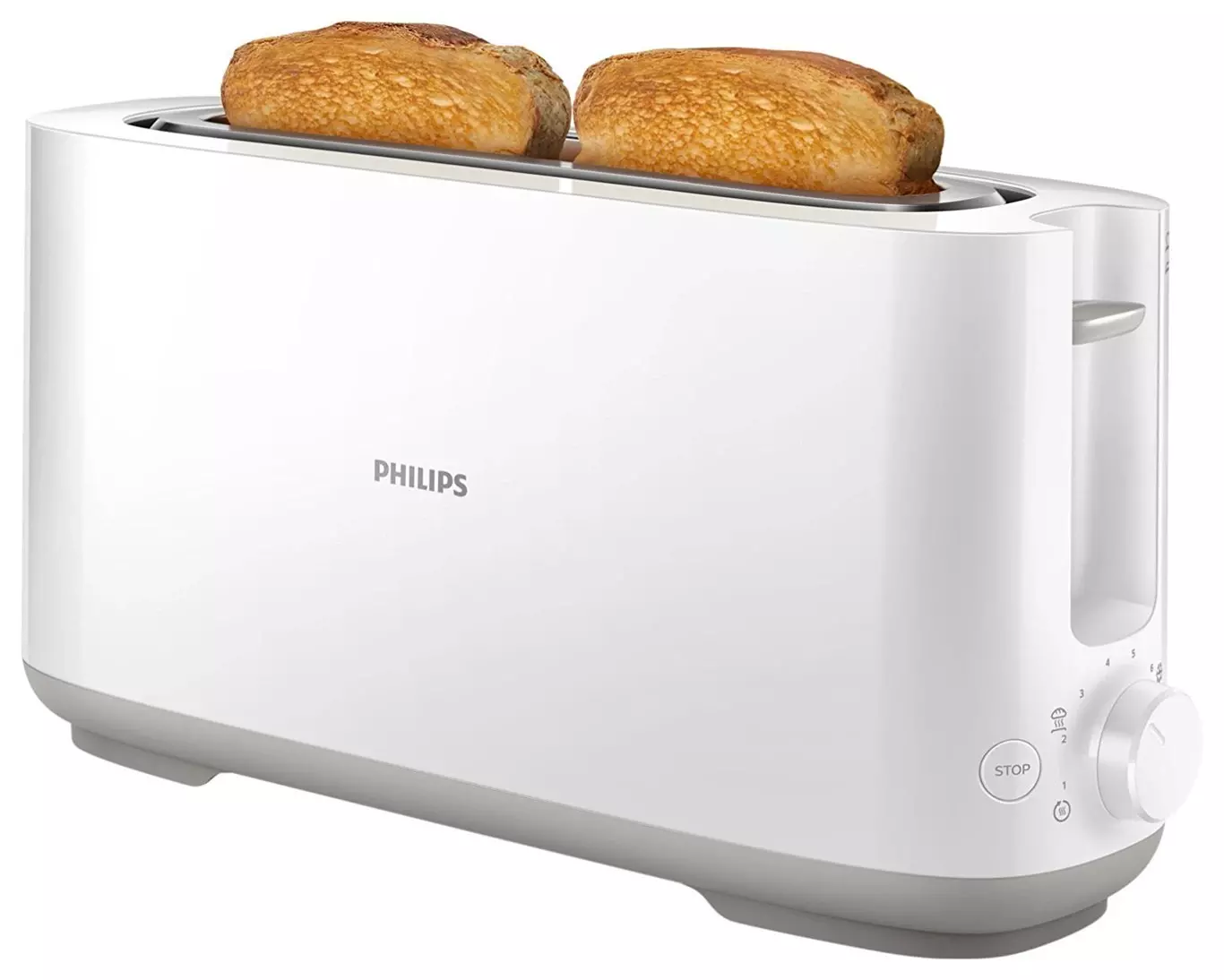 Diseñado y fabricado por la marca Philips, este tostador cuenta con una línea muy discreta en color blanco, formas redondeadas y un estilo apto para tenerlo a la vista en la mayoría de cocinas. Nos permite seleccionar un grado de tostado ajustable entre 8 niveles, con función para panecillos incluida y también de descongelación. Gracias a su ranura extralarga podemos tostar diferentes tipos de pan, incluso los más grandes. Cuenta con exterior de pared fría y patas antideslizantes para mayor seguridad. Tenemos más info e imágenes en la web oficial de Philips.