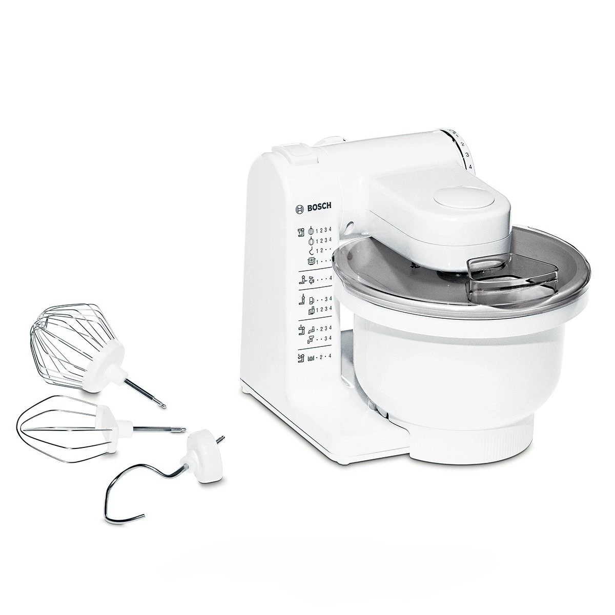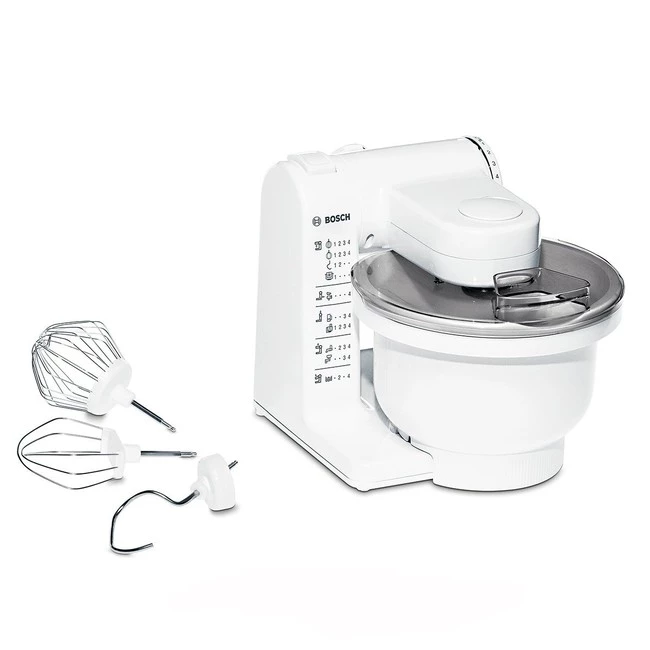 Incluye un bol plástico de alta resistencia y gran capacidad de hasta 2 kg de masa y 3,9 litros. Hay otra versión con bol de acero inoxidable pero su precio es de 99 euros. Gracias a la tapa con orificio de llenado se pueden añadir ingredientes mientras el robot está trabajando, lo que es ideal para rectificar recetas o aumentar cantidades. Además cuenta con un kit para repostería compuesto por un garfio amasador, una varilla mezcladora y una varilla montadora en acero inoxidable. Obviamente podemos ampliar estos accesorios con otros ofertados por Bosh.