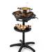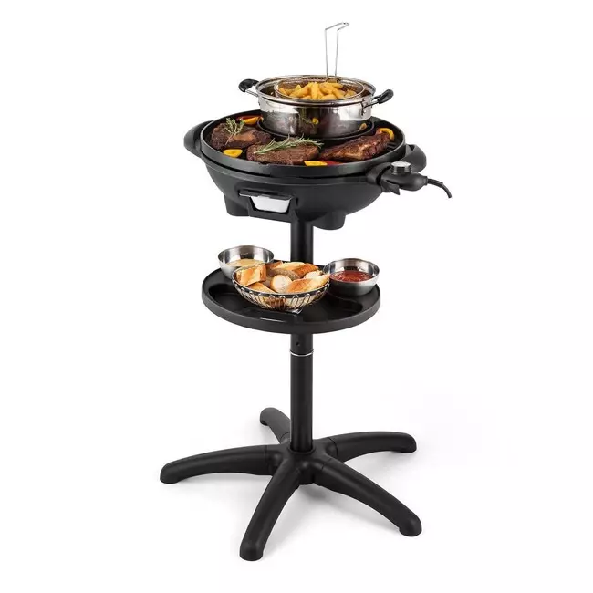 Como podemos ver en la imagen superior estamos ante un grill eléctrico con pie ajustable para su uso como grill de pie (aunque se pude adaptar también a una mesa) Cuenta con una potencia de 1660 W aunque podemos regularla en 5 niveles de temperatura. El grill tiene 40 cm de diámetro por lo que podemos cocinar para varios comensales a la vez. El set además viene con cubierta de grill (la podemos ver en la imagen inferior), olla de acero inoxidable con escurridor de fritos y repisa. Las dimensiones del grill de pie con cubierta, que sería su altura máxima, son de 66 x 100 cm.