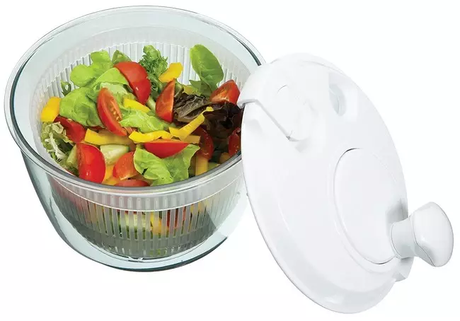Este centrifugador de ensaladas cuenta con un diámetro de 19 cm, lo que le hace adecuado para porciones individuales o dobles. En caso de que en ocasiones especiales necesitemos de más capacidad, podemos usarla en tandas. Además de permitirnos quitar rápidamente el agua sobrante de la lechuga, la tapa cuenta con una abertura para la adición de aderezo para ensaladas. El recipiente puede ser usado como fuente para servir ensalada, mientras que el cesto de secado se puede utilizar como un colador.