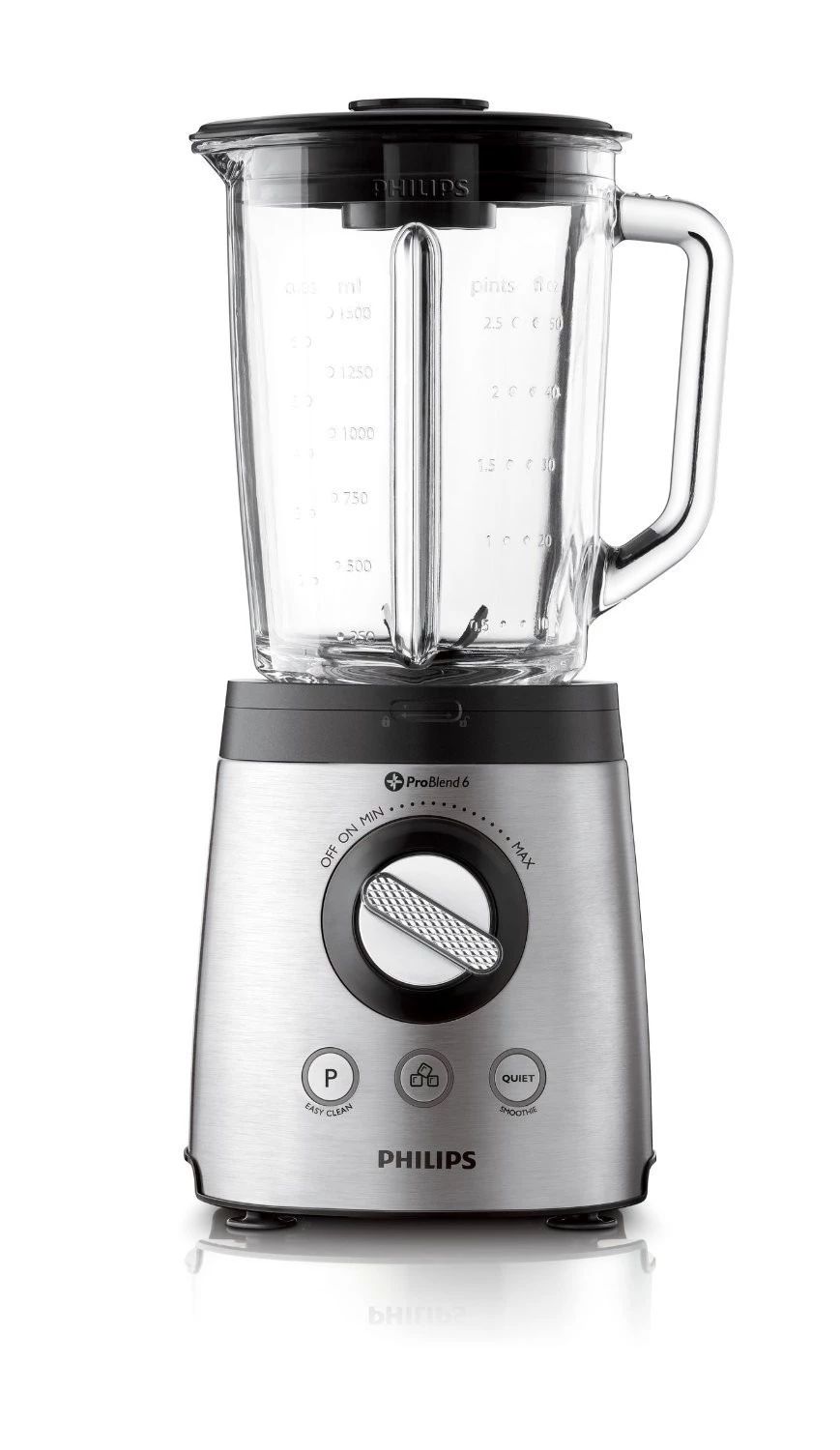 Esta batidora diseñada y fabricada por uno de los líderes del sector de los electrodomésticos como es Philips, cuenta con un potente motor de 900 W encargado de mover la cuchilla de 6 hojas ProBlend en acero inoxidable para batir y cortar de manera eficaz situada en la base de la jarra, que tiene una capacidad de dos litros.