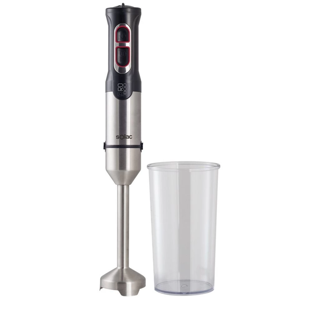 Quienes necesiten una batidora nueva y duradera a buen precio tienen la oportunidad de hacerse con esta Solac de 800 W de potencia con cuerpo y pie en acero inoxidable y cuchillas de alta resistencia y durabilidad. Cuenta con dos velocidades: la normal y una turbo que pueden seleccionarse a través de su selector de velocidad con luz LED que nos marca cual de ambas está seleccionada. Aparte de la batidora nos viene con un vaso de plástico de un litro de capacidad para batir dentro sin rayar otros utensilios. No hubiera estado mal que el vaso tuviese medidor pero no es el caso.