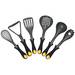 El set está compuesto por un cucharón, una espumadera, un batidor, un servidor de pasta, un majador de patata, una espátula con ranuras y el propio soporte para utensilios. En total siete piezas.