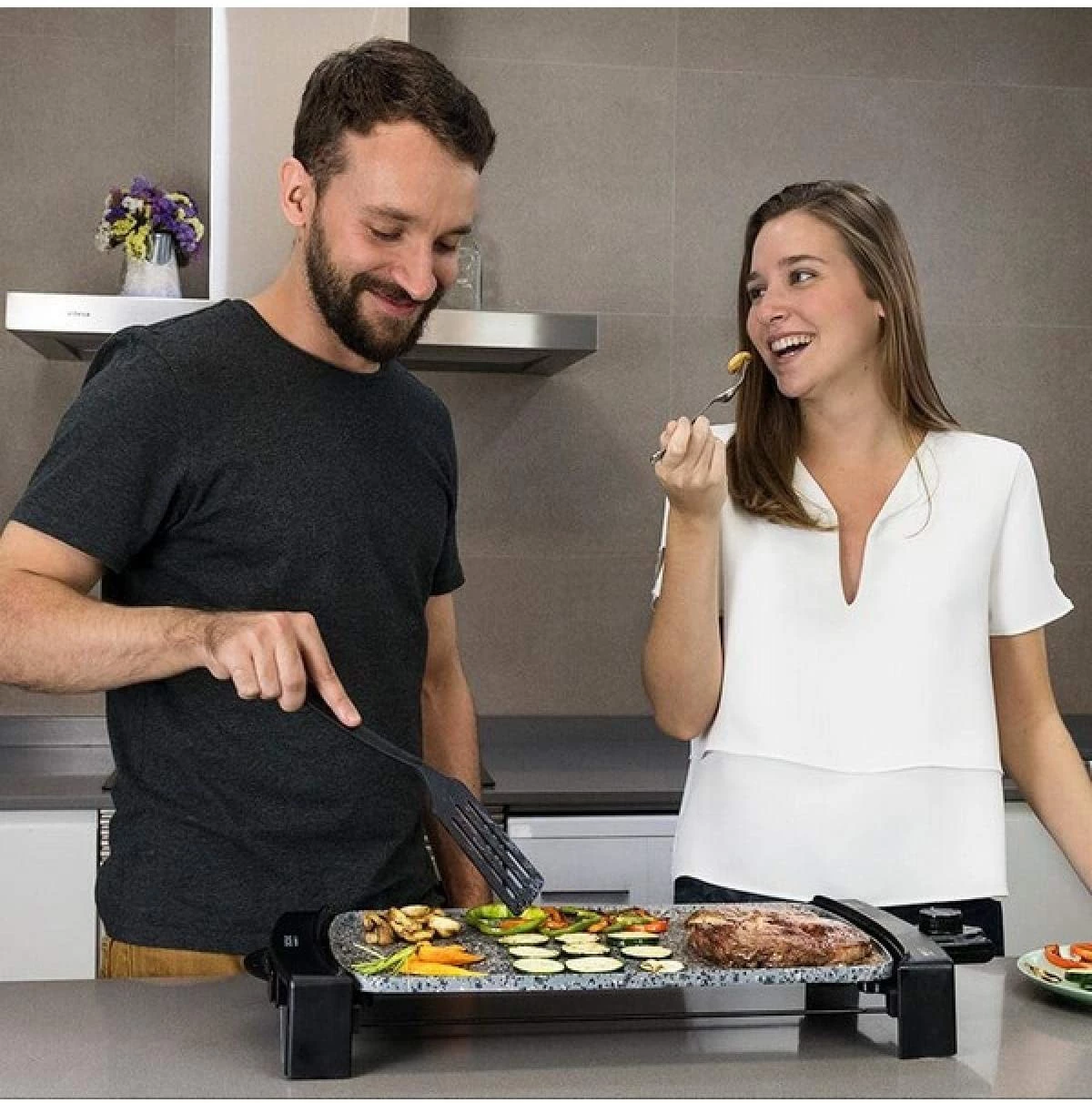 Ideal para carnes y verduras, esta plancha de Cecotec Rock&Water 2500 cuenta con revestimiento cerámico de piedra de tres capas para ofrecer una óptima antiadherencia. Está fabricada con cuerpo de aluminio fundido de 2,5 mm de grosor y dispone de una amplia superficie de cocinado de 45 x 25 cm.