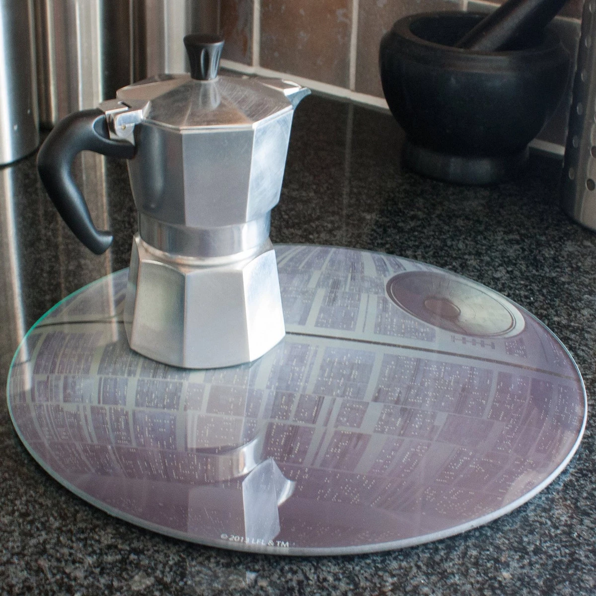 Esta tabla de cortar Estrella de la Muerte de Star Wars tiene un increíble y logrado diseño. Su diámetro es de 30 cm, más que suficiente para un buen uso en cualquier cocina. La tabla está fabricada en resistente cristal templado e incluye goma antideslizante en su parte posterior para que no resbale en la encimera.Soporta hasta 180ºC de calor y puede ser utilizada de salvamanteles sin peligro.