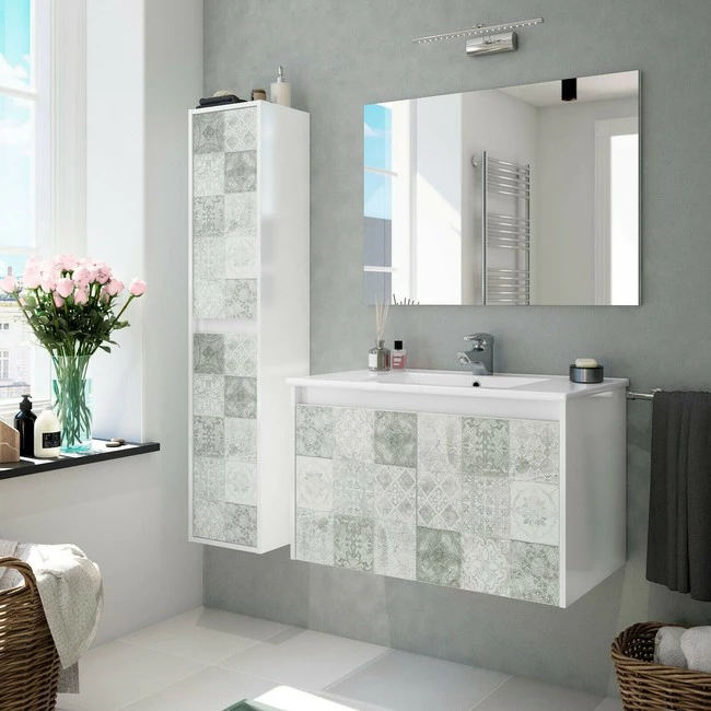 - Solo 79,99 euros cuesta este módulo para el baño con estampado de baldosa hidráulica a la última. Incluye lavabo y espejo.
