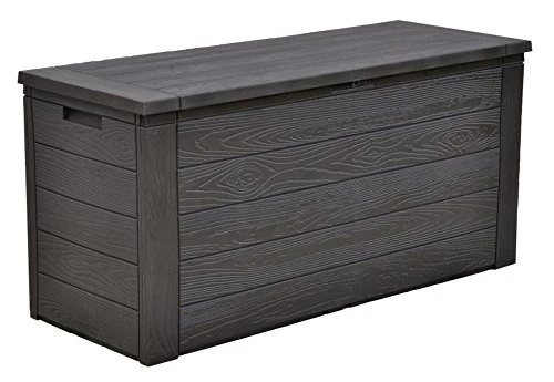 Diseñado especialmente para exteriores (aunque también puede ser utilizado en interiores, como por ejemplo un garaje o una caseta de jardinería), este baúl de plástico cuenta con una capacidad de 300 litros de almacenaje, contando con un efecto madera que lo hace indicado y decorativo para exteriores con jardín. Sus medidas son de 120 x 52 x 54 cm de alto, por lo que podemos guardar una gran cantidad de objetos en su interior. Tiene un fácil montaje y es muy ligero (poco más de cinco kilos) por lo que es fácil de mover cuando está vacío.