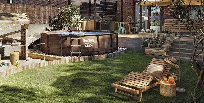 Esta piscina es resistente a los pinchazos y rayos UV y puede ser tuya por 179 euros (en lugar de 269 euros). Su capacidad es de 9677 l y se puede conectar a la manguera de flujo incluyendo además una escalera y depuradora de cartucho. Medidas 82x457x457 cm.
