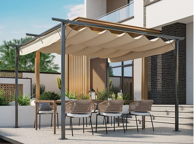 Esta pérgola está diseñada para quienes no pueden o no quieren colocar toldos en su terraza o jardín, permitiendo colocar una estructura resistente allí donde nos interese. Fabricada en acero cubierta con polvo resistente al óxido, esta pérgola de jardín tiene un toldo retráctil, lo que permite ofrecer más o menos sombra según nuestras necesidades. También podemos plegarlo en momento de viento para garantizar su durabilidad.