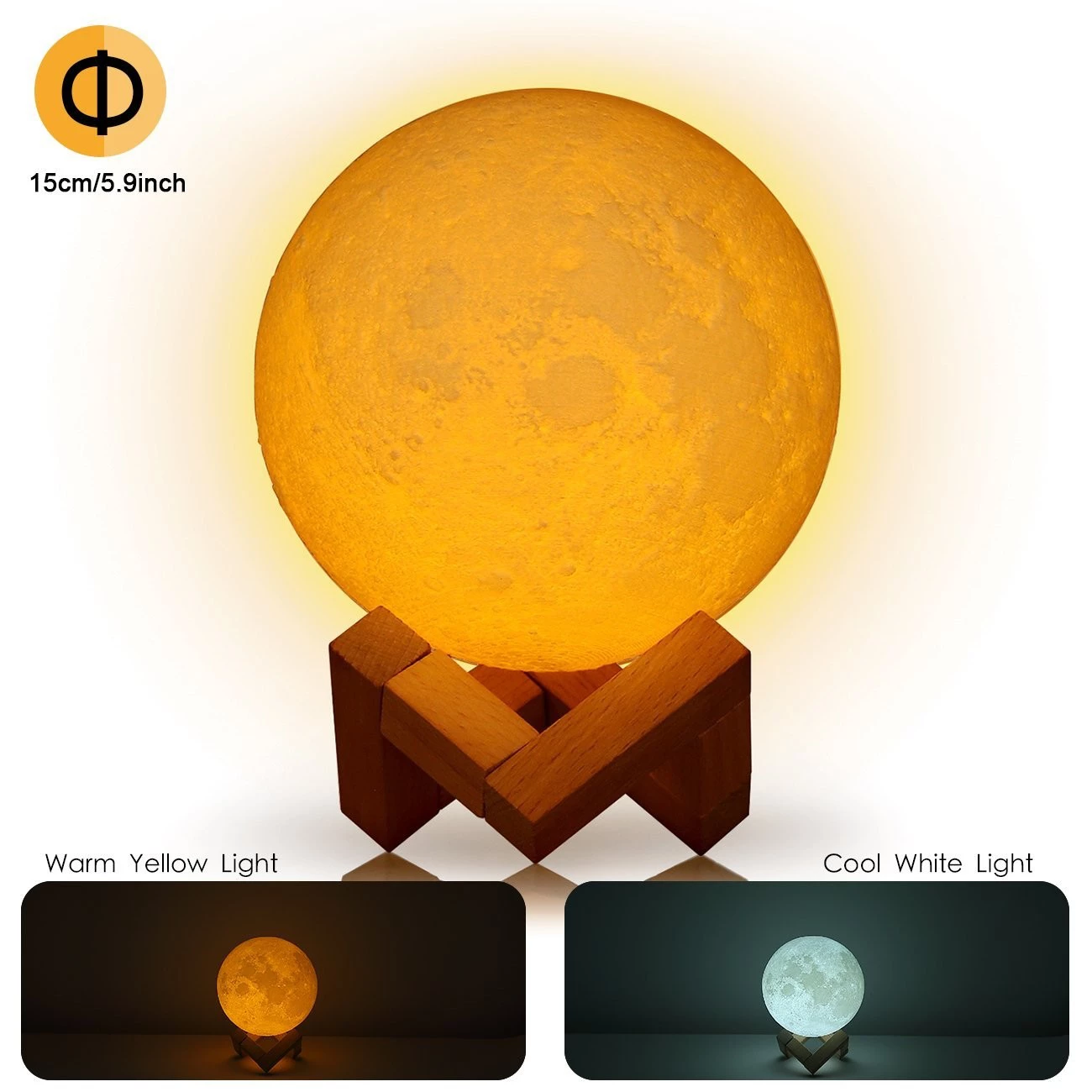 Esta lámpara está fabricada por la innovadora tecnología de impresión 3D y reproduce la superficie lunar con detalle. Nos permite tenerla con luz cálida amarilla o fría blanca a diferente intensidad. En su interior tiene una batería recargable con carga USB que aguanta hasta 8 horas sin necesidad de ser recargada. Puede llevarse de un sitio a otro ya que no necesita estar conectada a la red eléctrica en todo momento.