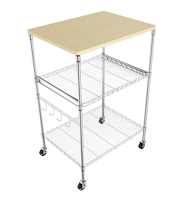 Como podemos ver en la imagen superior estamos ante un carrito auxiliar con ruedas fabricado en acero con mesita en la parte superior. Su tamaño es de 62 x 47 x 91 cm y destaca, tal y como podemos ver en la imagen inferior, por tener una bandeja extraible en el medio, lo que nos permite acceder mejor a aquello que coloquemos en esa posición, ya sena frutas, servilletas, utensilios de cocina, etc. En uno de los laterales incluye cuatro ganchos para colgar.