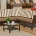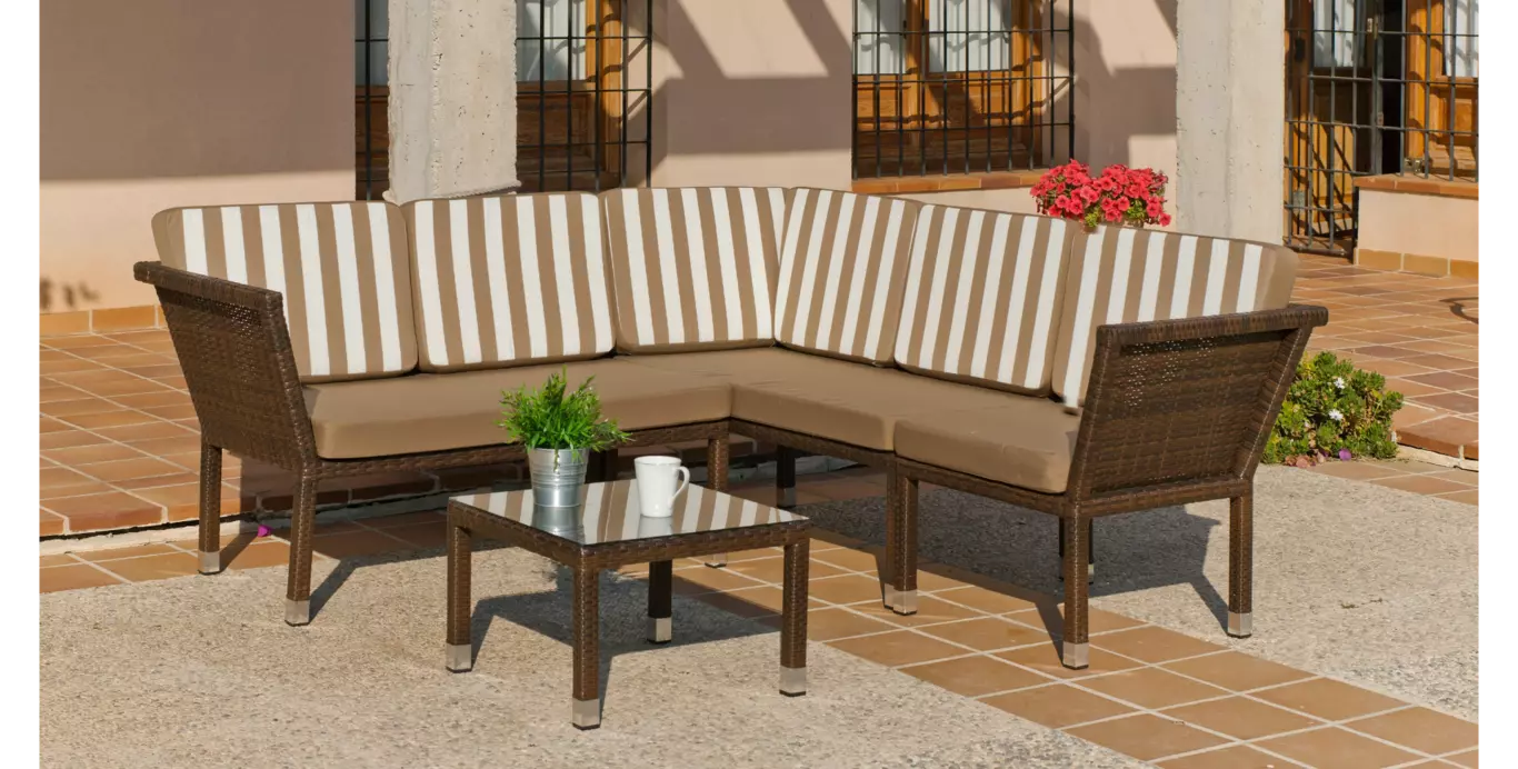 Set compuesto por: dos sofás biplazas (75 x 50 x 75 cm), un módulo rincón central (75 x 50 x 75 cm) y una mesa de centro (60 x 60 x 50 cm). Trae nueve cojines para protegerlos de las condiciones meteorológicas. 430 euros (antes 799 euros).