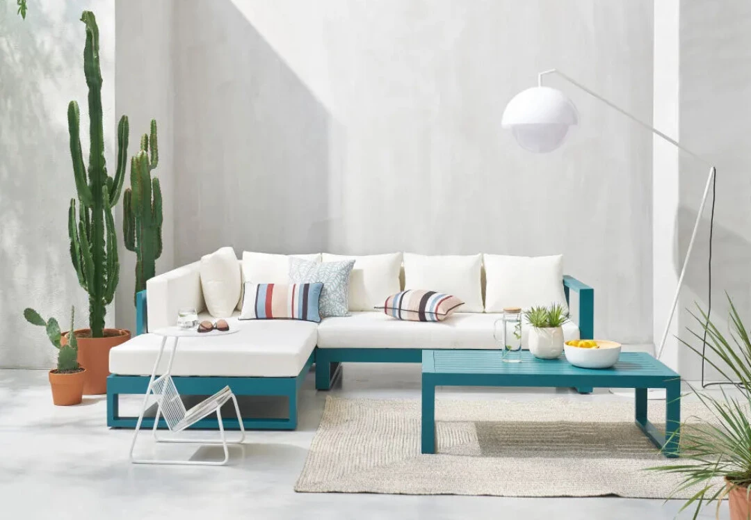 Si buscas un conjunto para relajarte sin preocupaciones, este está disponible por 839,30 euros (en lugar de 1.199 euros). Está compuesto por un sofá de 4/5 plazas con cojines blancos y estructura de acero azul además de una mesa baja del mismo color. Medidas 76 x 248,5 x 181 cm.