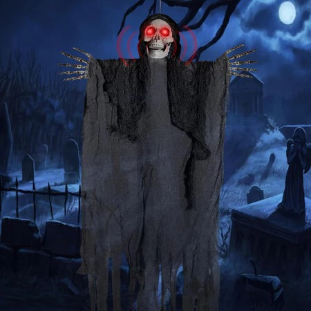 Por muy poco dinero podemos hacernos con esta decoración de grandes dimensiones (como podemos ver en la imagen suprior, ocupa unos 55 centímetors de ancho con una altura de un metro aproximadamente). Pero no sólo su presencia es lo que causa terror: también incorpora un efecto aterrador con el sistema de control de voz y los ojos LED parpadean en rojo. Además, si lo colocamos en exteriores, el vestido se balancea con el viento.