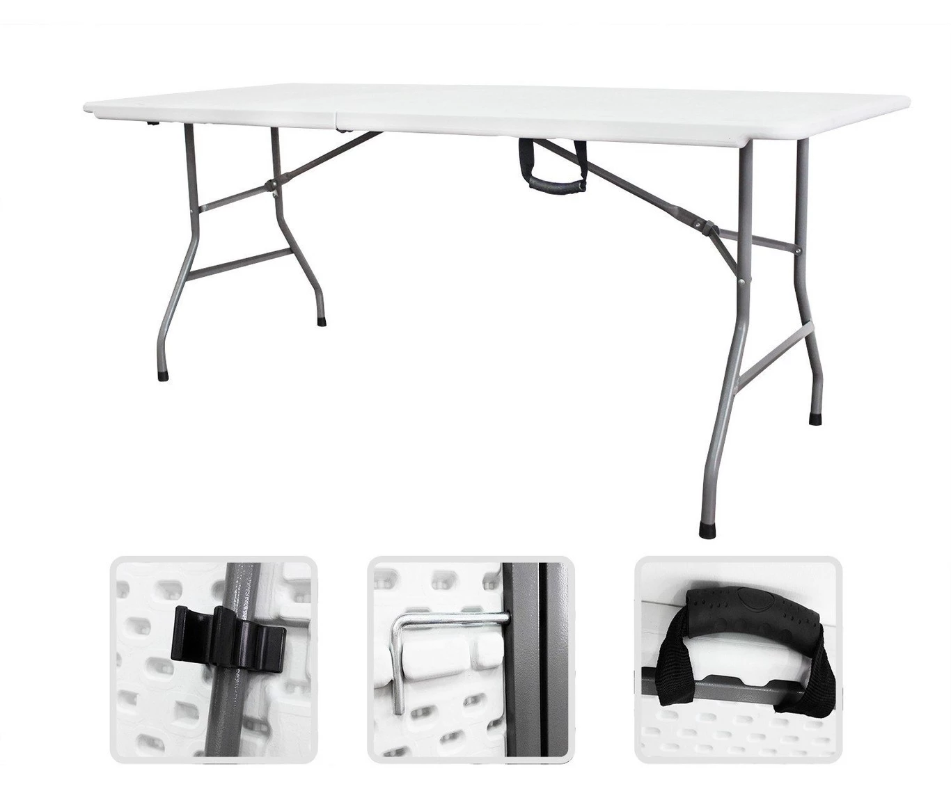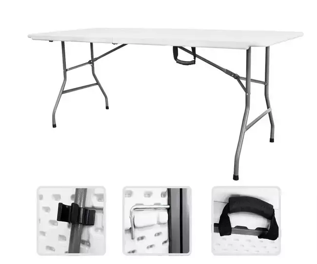 Esta mesa de catering es ideal para quienes salgan de camping con frecuencia o para quienes quieran tener en casa una mesa auxiliar para celebraciones u otros eventos en los que sea necesario ampliar el espacio para los comensales. Como ya hemos señalado tiene unas medidas una vez abierta de 183 cm de longitud x 75cm de anchura x 74 cm de altura mientras que una vez plegada el espacio que ocupa es de 91.5cm x 75cm x 8.5cm.