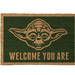 Está fabricado en PVC y fibra de coco, con un tintado verde que nos dejará ver la cara de Yoda y la frase "Welcome You Are".