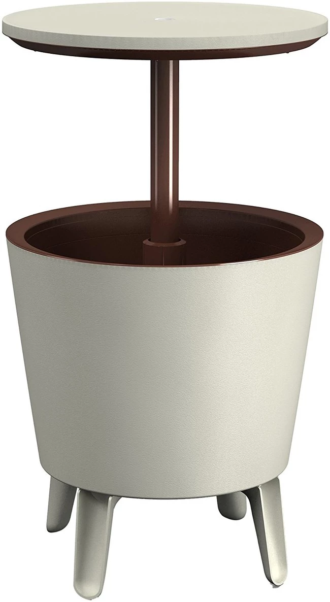 Esta curiosa mesa de exteriores puede ser un gran aliado para fiestas y barbacoas ya que de una manera muy sencilla a la par que elegante, se convierte en una nevera con capacidad para hasta 45 latas gracias a su hueco en la parte inferior, que podemos rellenar de hielo manteniendo fresca la bebida. Incluye válvula de desagüe en la parte inferior y está fabricada en resina, por lo que no habrá problemas de humedades. Sus medidas son 49,5 cm de diámetro, con una altura máxima en abierto de 84,3 cm cuando puede servirnos como mesa alta y una altura en cerrado de 57 cm. Su capacidad es de 42 litros.