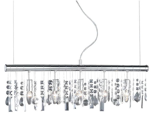 La lámpara de techo con cristales color cromado de Wofi es una lámpara colgante de 80 centímetros de largo fabricada en metal con color cromo. Necesita de cinco bombillas que no van incluidas con el producto. El rendimiento de la luz es de 40W.