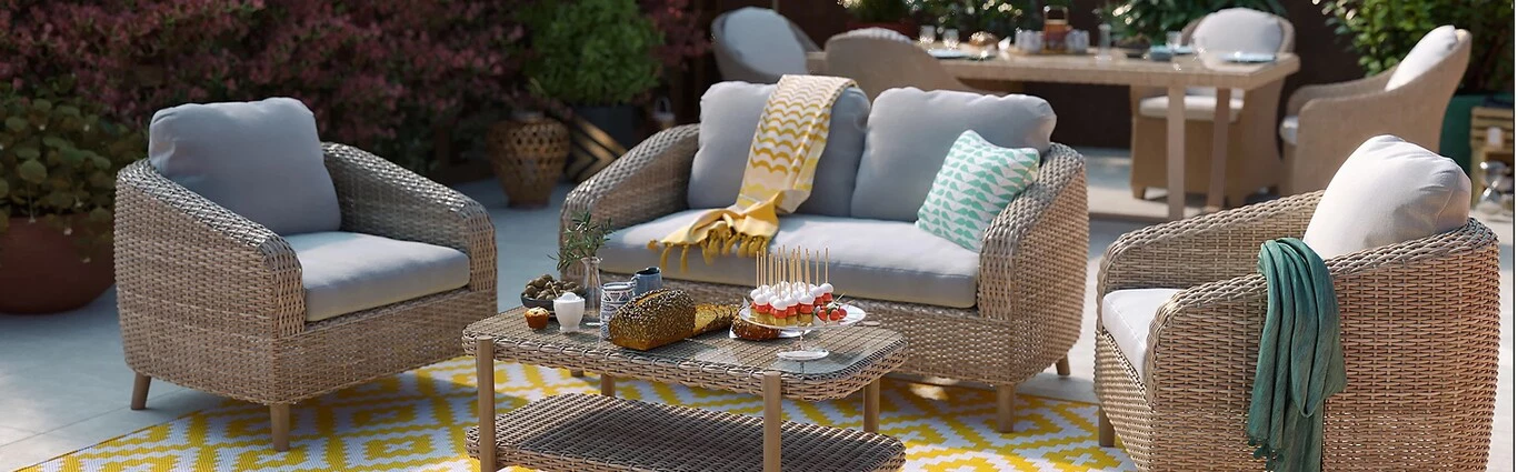 Este conjunto de jardín Madison de dos plazas baja su precio desde 240 a 129,90 euros. Está compuesto por dos sillones individuales de 74 x 66 x 72 cm y una mesa de 57 x 57 x 34 cm. Incluye cojines de asiento y respaldo.
