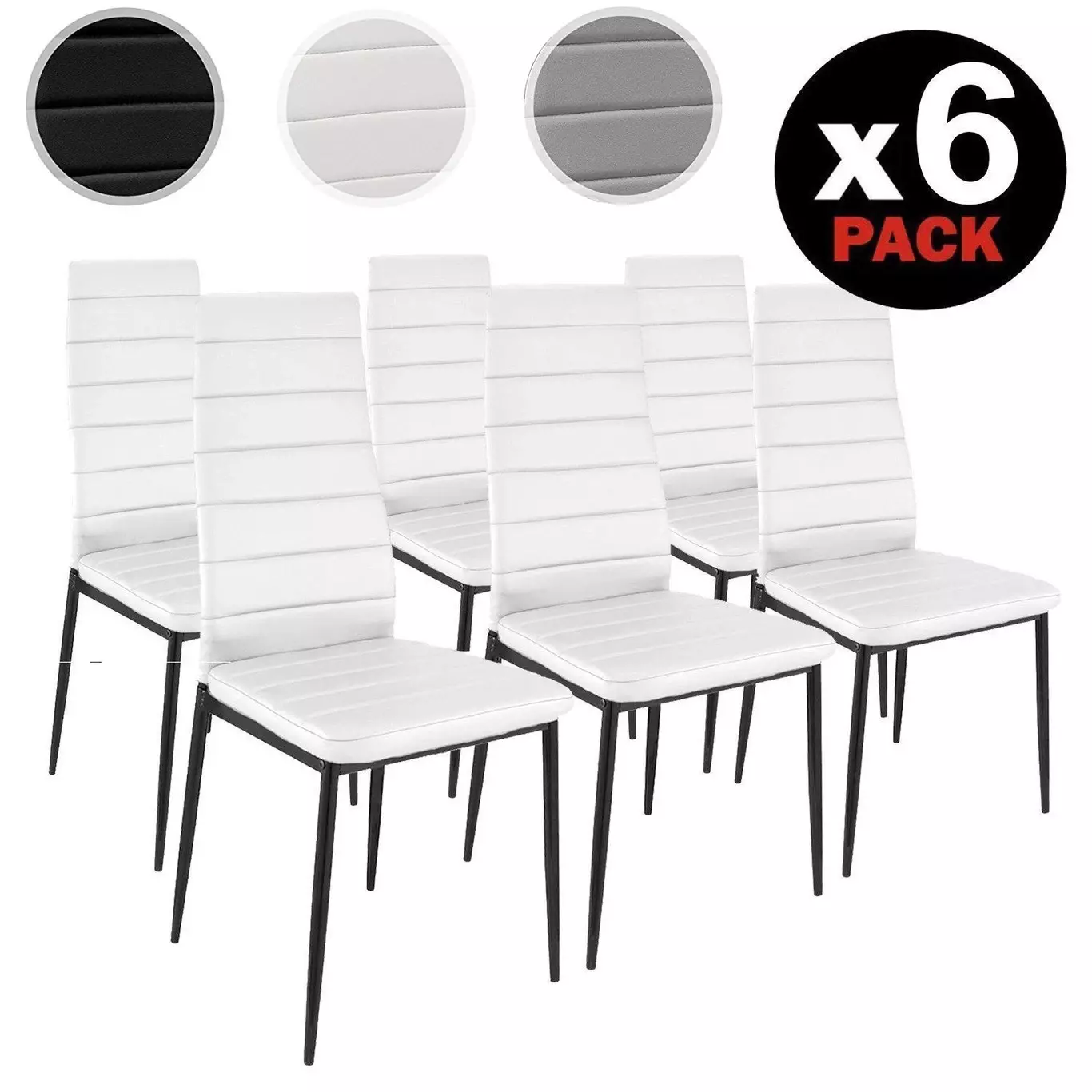 Estaban disponibles en 3 colores blanco, gris y negro, sin embargo las negras ya se han agotado. Las sillas tienen unas medidas de 44 cm (ancho) x 96 cm (alto) x 42 cm (fondo)y una altura del asiento de 44 cm. Están tapizadas en símil piel y las patas son metálicas.