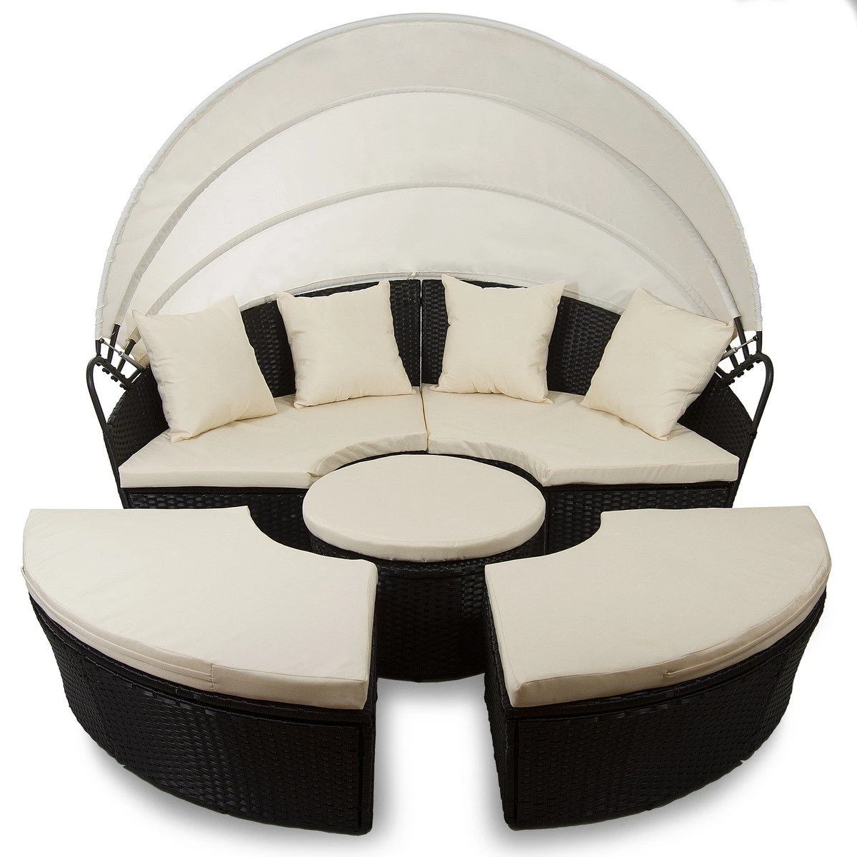Se trata de un sofa de color blanco y negro con capacidad hasta para 8 personas, con fundas extraíbles que se pueden lavar en la lavadora, viene con 4 cojines y tiene un sistema hidráulico para abrir el toldo. En las patas trae protectores para evitar que se arañe, esta fabricado con rattan sintético y trae 2 asas para transportarlo fácilmente.