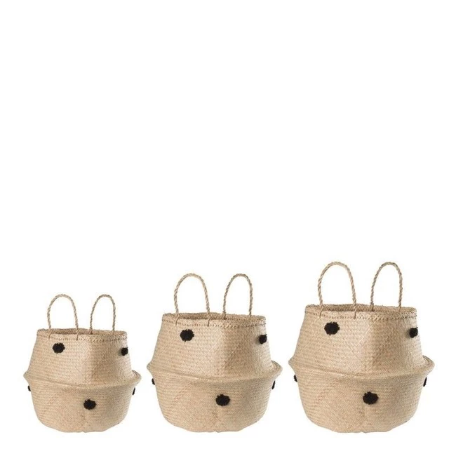 Disponible en tres tamaños y con los pompones en dos colores, este cesto trenzado a mano 100% natural está realizado con junco y con materiales que respetan el medio ambiente. Puedes utilizarlo como almacenaje extra o incluso como macetero. Dale un toque bohemio y actual a tu salón, dormitorio o zona de juegos con este dulce y divertido cesto en color beige natural.
