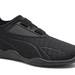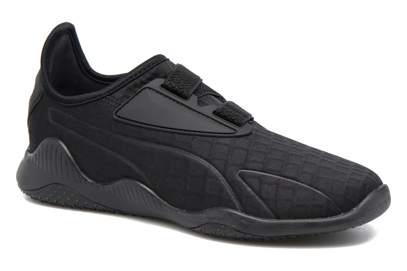 Como podemos ver en la imagen superior estamos ante unas llamativas zapatillas de diseño vanguardista de la marca Puma. Totalmente en negro, llaman la atención por su cierre de velcro reforzado por una pieza de goma. Tienen una talonera envolvente para sujetar el tobillo con firmeza sin por ello dejar de ser de caña baja.