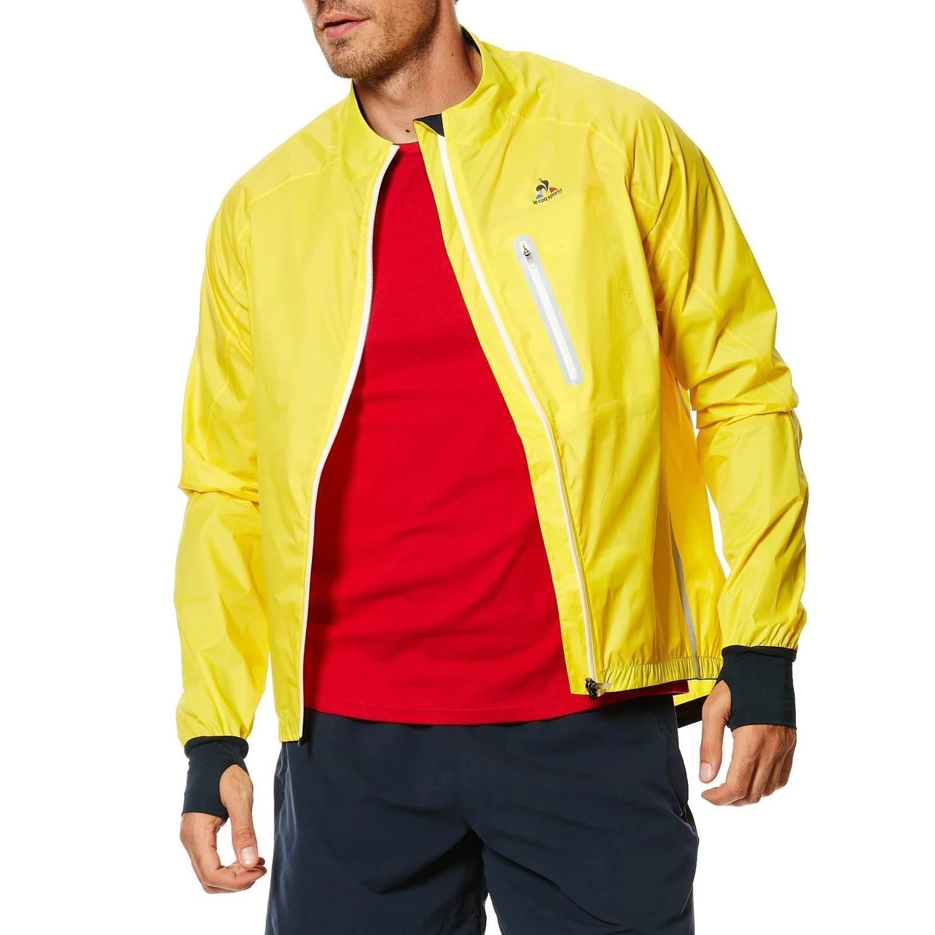 Con un diseño más corto por delante que por detrás, en color amarillo, con bandas laterales y cremallera blanca. Este cortavientos Le Coq Sportif es perfecto para bicicleta gracias a su diseño llamativo, las mangas extendidas hasta las manos a modo de guante, para mayor comodidad, un bolsillo trasero y otro frontal ambos, con cremallera y su tejido tan ligero como transpirable.
