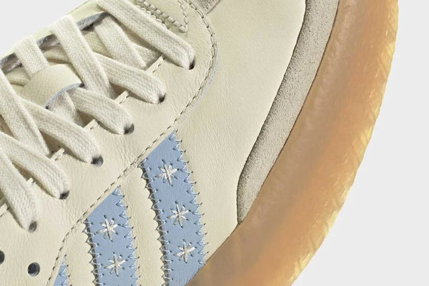 Lo más destacable de estas zapatillas no es la suela, sino la parte superior hecha de cuero blanco con partes de ante en la zona del talón y puntera además de bordados en punto de cruz por las franjas laterales. Se cierran mediante cordones como es habitual y cuentan con un poco de acolchado en la zona del tobillo bajo.