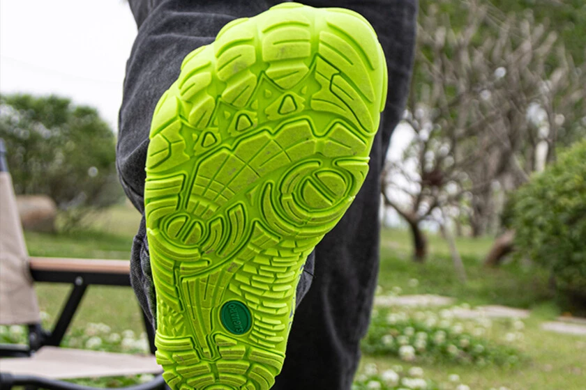 La puntera redondeada con corte ancho deja libertad de movimiento a los dedos al igual que si estuviéramos descalzos y a complementada en el interior con una plantilla elástica que protege al pie con una gran amortiguación. La suela de goma aunque no es muy fina del todo, ofrece un drop 0 y una adherencia al caminar en cualquier terreno gracias a su dibujo de patrón.