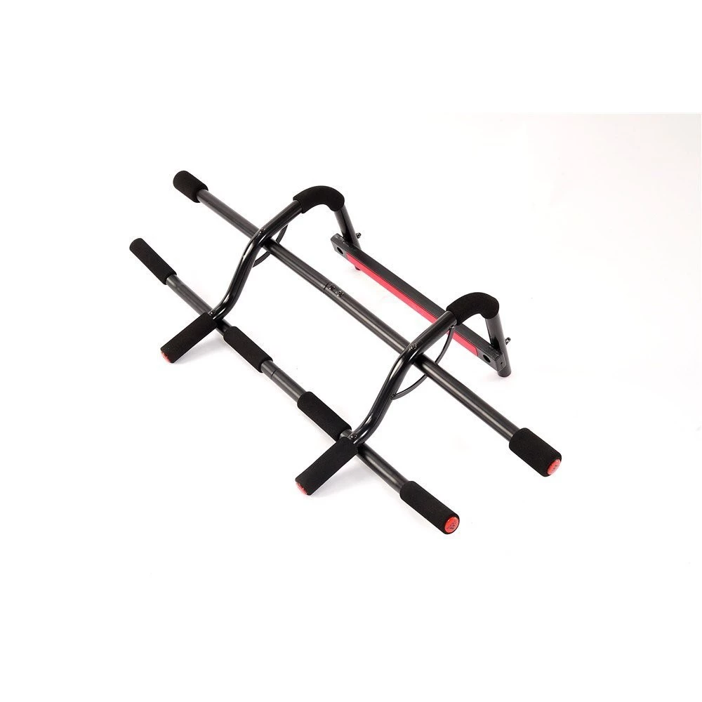 Con esta barra de dominadas podremos hacer una serie de ejercicios de cuerpo superior e inferior de gran eficacia utilizando el peso corporal al colgarlo del marco de la puerta. También se puede utilizar en el suelo para flexiones de tríceps y dominadas. Este set cuenta con un sistema de contrapeso para asegurarse a la mayoría de las puertas. Cuenta con cuatro opciones de agarre.
