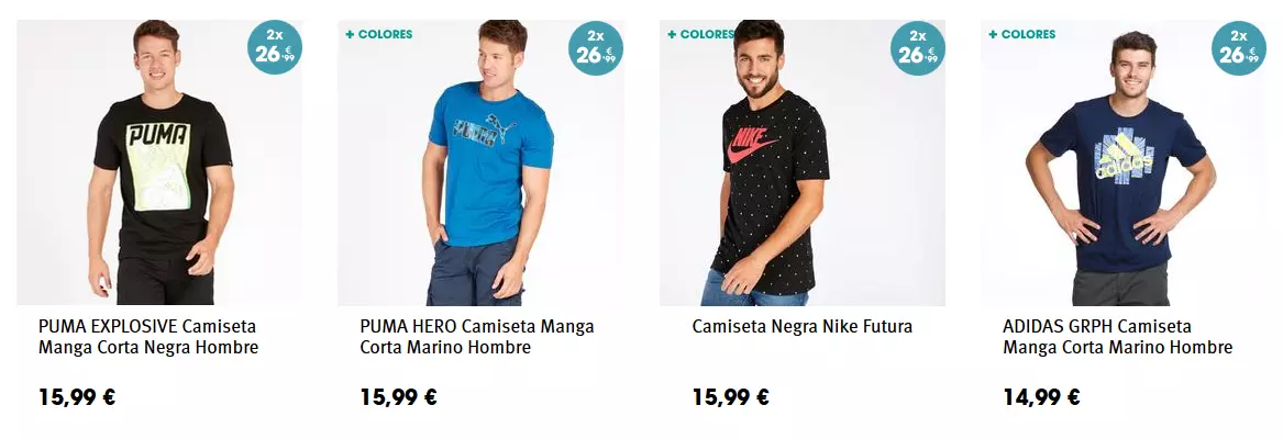 Esta promoción de Sprinter es bien sencilla de aprovechar. Tan sólo debemos seleccionar dos camisetas de entre las de esta selección para que automáticamente se les rebaje el precio y pasen a costar sólo 26,99 euros en total.