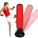 Se trata de un saco de boxeo de pie con diseño de torre de color rojo y negro, que pueden usar tanto los niños como los mayores. Es un saco de boxeo hinchable y para ello nos lo envían con un inflador. Es de PVC resistente, la base se puede rellenar con agua para que el saco tenga una mayor estabilidad y su medida es de 160 cm.