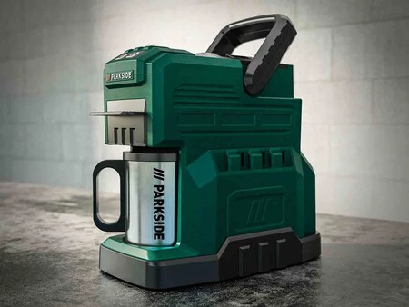ZAHRRAMARI Cafetera portátil a batería de 20V de Parkside - Apta para café molido y cápsulas - Con carcasa resistente, con asa para un transporte sencillo; pequeña y manejable.