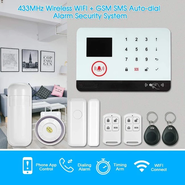 Incluye un panel de alarma WIFI + GSM, un sensor PIR, un sensor de puerta, una sirena con cable, dos tarjetas RFID (para activar y desactivar la alarma fácilmente) y dos mandos a distancia.