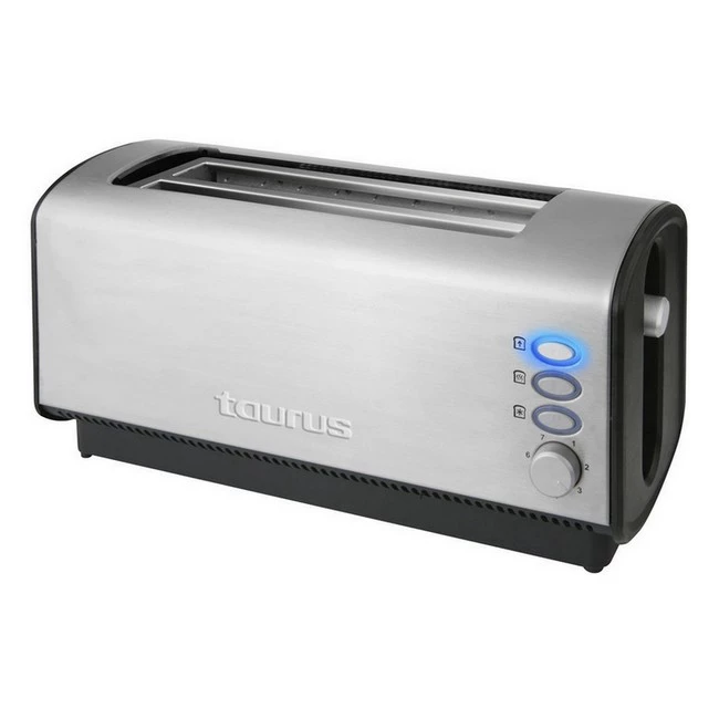 Como podemos ver en la imagen superior el tostador Planet Duplo Legend cuenta con doble ranura extra larga que nos permitirá tostar cualquier tipo de pan. No solo tosta, también tiene funciones específicas para calentar y descongelar. Tiene una potencia de 1200 W y acabado en acero inoxidable, con botones iluminados. Viene con hueco para alojamiento para el cable y bandeja recogemigas. Sus medidas son 42,2 x 18,8 x 18,8 cm. tenemos más info e imágenes en la web oficial de Taurus.