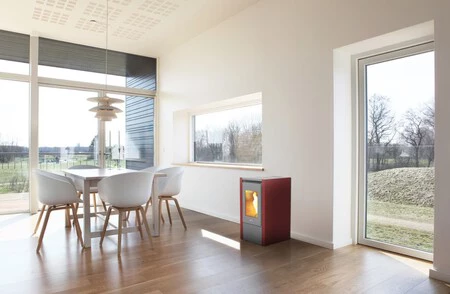 Su diseño de doble cámara con 6kW de potencia, permite regular la temperatura de forma automática y además tiene un rendimiento de 89,3% apto para espacios de hasta 43,2 m². Cuenta con algunos elementos como depósito de 11 kg, salida de humos, sistema de cristal limpio, quemador de hueso compatible y clasificación energetica A+ que la hace una de las más eficientes del mercado para instalar en tu hogar.