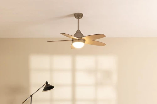 Si estás cansado de tener que cambiar cada año tu ventilador de techo, este modelo es todo lo que necesitas ya que lo usarás todo el año por muy poco dinero. Incorpora aspas reversibles en diferentes tonos de madera con función de verano e invierno que, según la rotación refresca la estancia o baja el calor del techo en los días fríos.