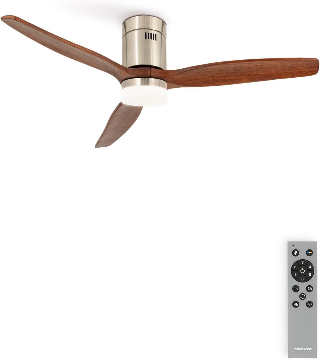 CREATE / WINDCALM NATURAL WOOD M/Ventilador de techo con luz níquel aspas madera oscura y mando / 40W, Temporizador, Ø132 cm, 6 velocidades, 3 temperaturas de luz, función verano-invierno